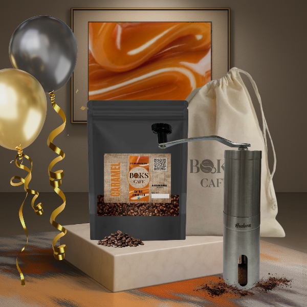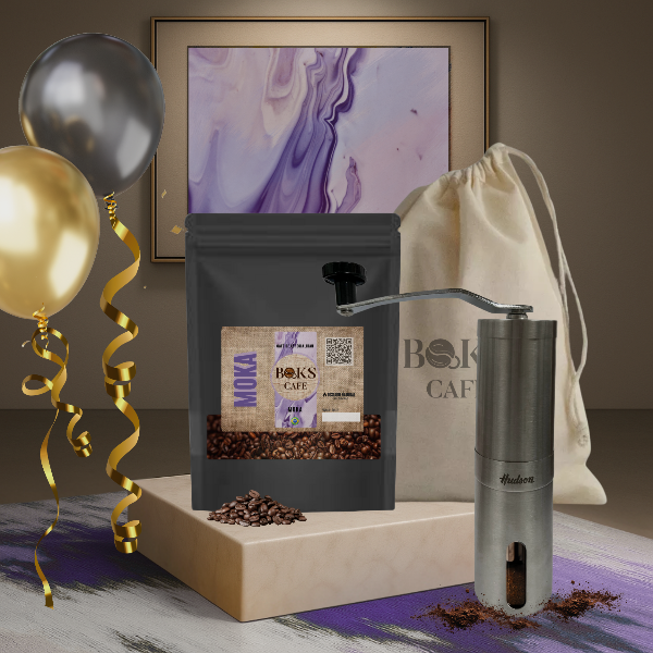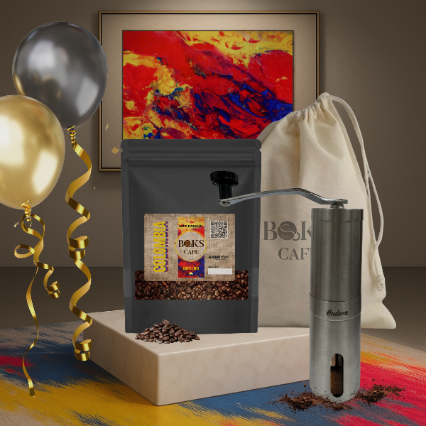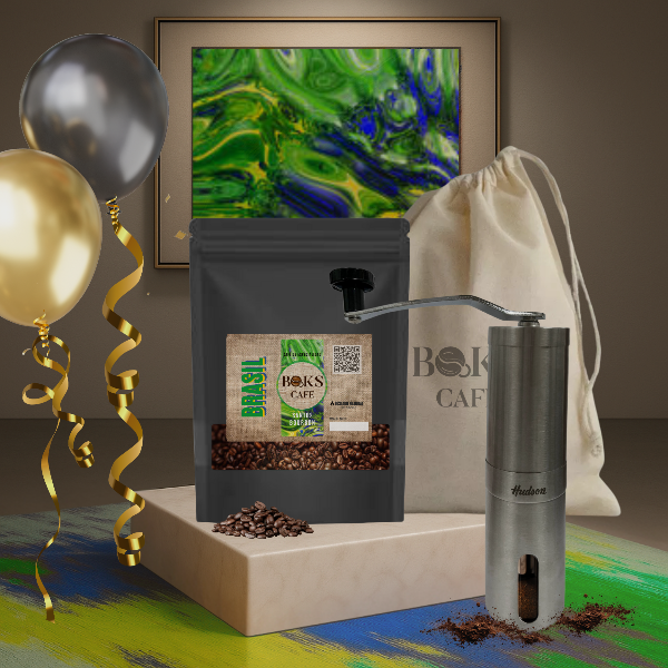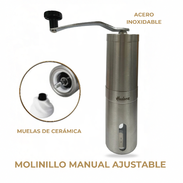Presentación: Una variedad de café en grano a elección en paquete Doy Pack de 250 grs., más un molinillo manual Hudson de acero inoxidable plateado, con molienda ajustable y muelas de cerámica; acompañado de una bolsa de lienzo 100% algodón para regalo.